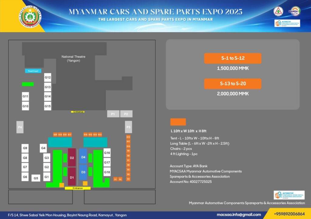 မြန်မာနိုင်ငံမော်တော်ယာဉ်အပိုပစ္စည်းလုပ်ငန်းရှင်များအသင်း (MYACSAA) နှင့် မြန်မာ့မော်တော်ယာဉ် ထုတ်လုပ်ရေးနှင့် ဖြန့်ဖြူးရောင်းချရေးလုပ်ငန်းရှင်များအသင်း (MAMDA) တို့ပူပေါင်းပြီး Myanmar Cars and Spare Parts Expo 2025 ပြပွဲကြီးအား နိုဝင်ဘာလ ၁၄ ရက်နေ့မှ ၁၆ ရက်နေ့အထိ ရန်ကုန်မြို့ အမျိုးသားကဇာတ်ရုံတွင် ကျင်းပပြုလုပ်မည်ဖြစ်ပါသည်။